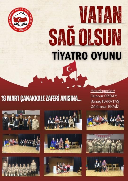 Şehit Mehmet Bora Tayfur İlkokulu olarak, yıl sonu etkinliklerimiz kapsamında 18 Mart Çanakkale Şehitleri anısına hazırladığımız “Vatan Sağ Olsun” adlı tiyatro oyunu, 28 Mayıs Çarşamba günü okulumuz konferans salonunda sahnelendi. Öğrencilerimizin üstün performans sergilediği bu anlamlı etkinlikte, izleyicilere duygu dolu anlar yaşatıldı. Yaklaşık iki saat süren tiyatro oyunu, seyircilerden tam not aldı.